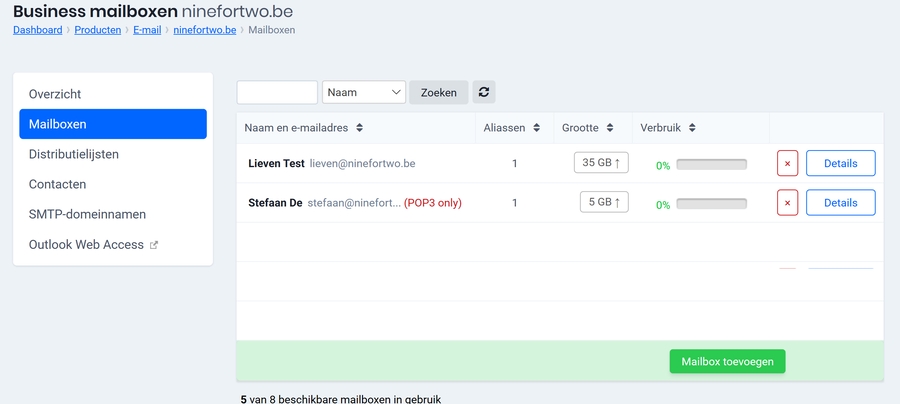 Zoek de mailbox die je wil wijzigen en klik op “Details”.