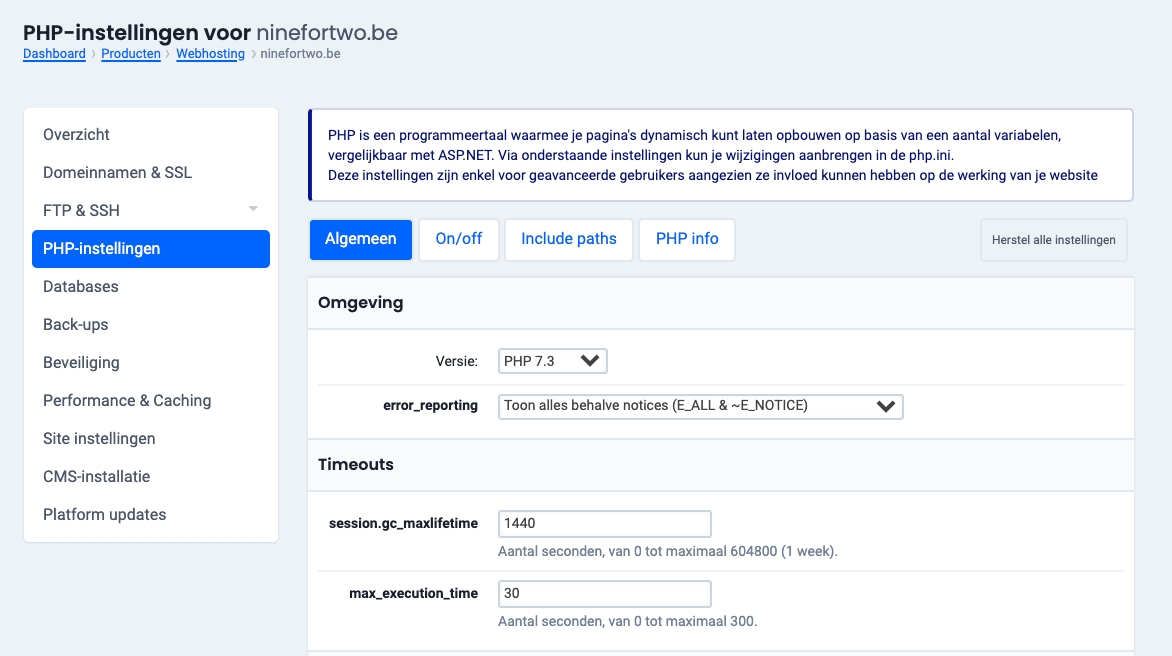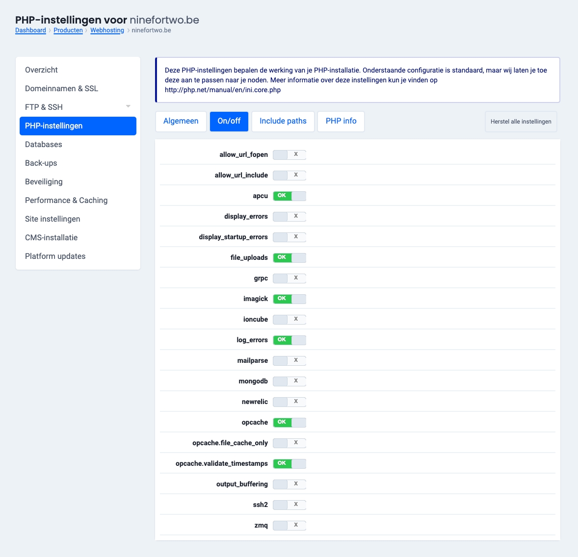 Via de tabbladen heb je toegang tot verschillende PHP-instellingen en zet je zaken aan of uit. Foutje gemaakt? Je kan altijd terug de standaard-instellingen herstellen via de link “Herstel alle instellingen”.