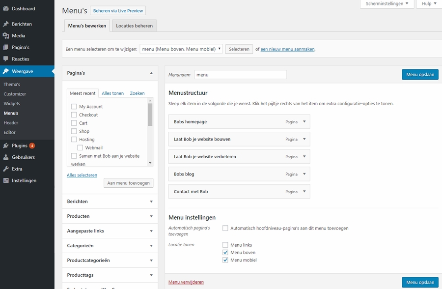 Veel thema's beschikken over een custom menu dat je zelf kunt indelen. In dat geval zie je in het menu “weergave” een submenu “Menu’s”.
